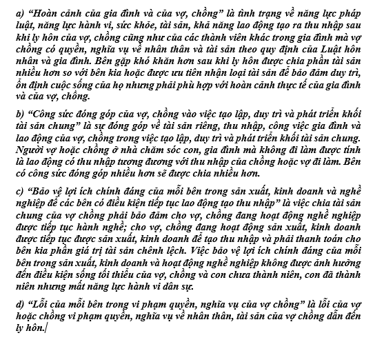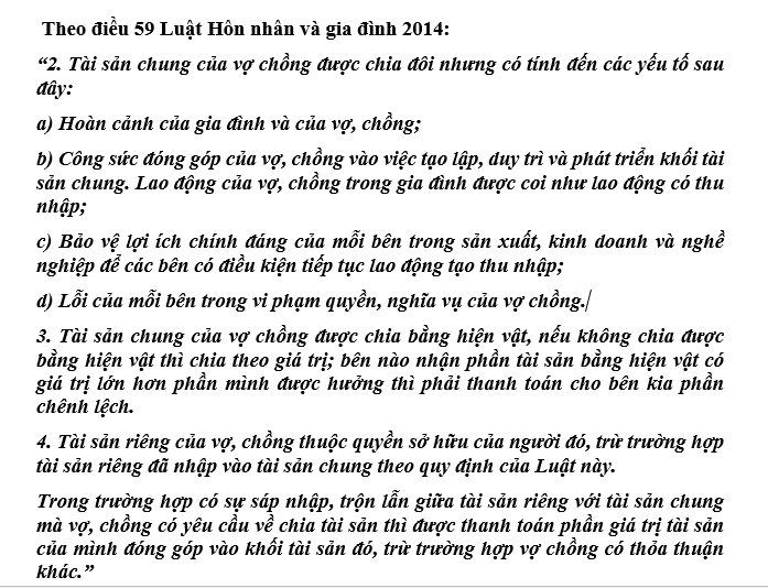 Như vậy, về cơ bản, tài sản riêng của ai thì người đó vẫn giữ nguyên quyền sở hữu còn tài sản chung dựa trên nguyên tắc chia đôi. Tuy nhiên, việc chia tài sản chung Tòa án cũng dựa trên một số yếu tố khác. Các yếu tố này được quy định tại thông tư liên tịch số 01/2016/TTLT-TANDTC-VKSNDTC-BTP có hiệu lực ngày 1/3/2016. Theo đó, những yếu tố tác động đến chia tài sản khi ly hôn gồm: