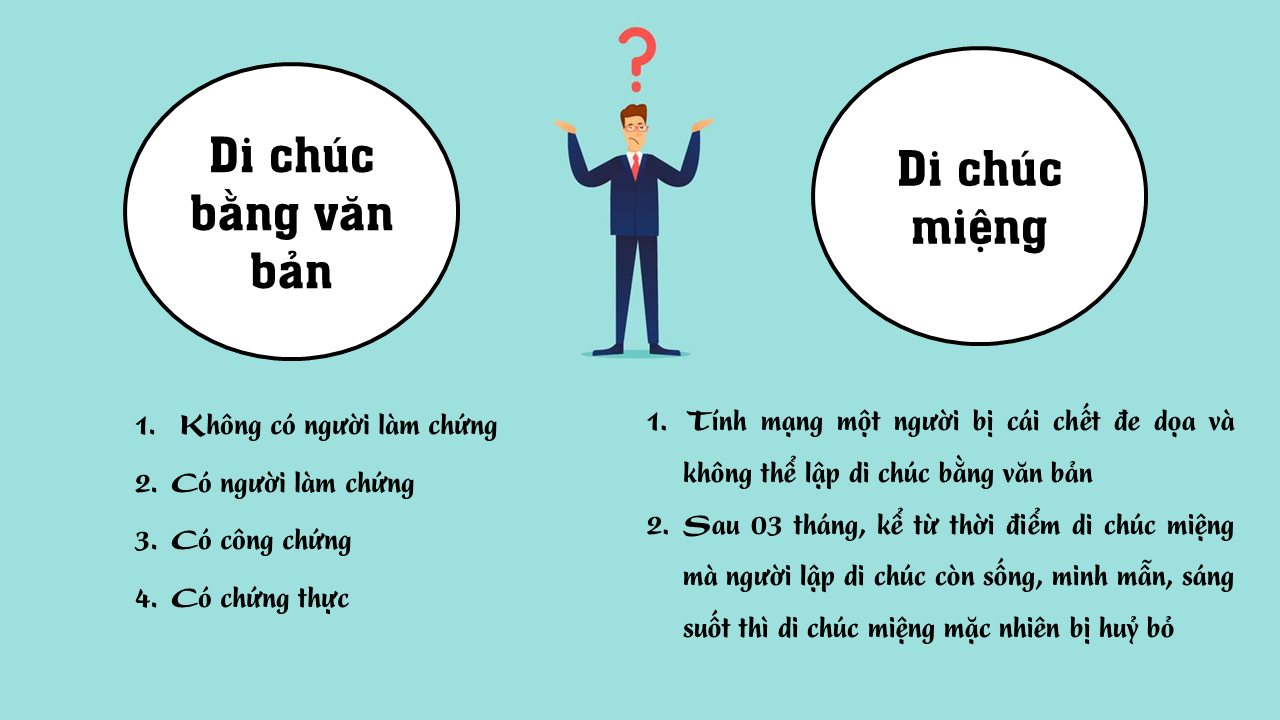 Có 2 hình thức di chúc: Di chúc bằng văn bản và Di chúc bằng miệng