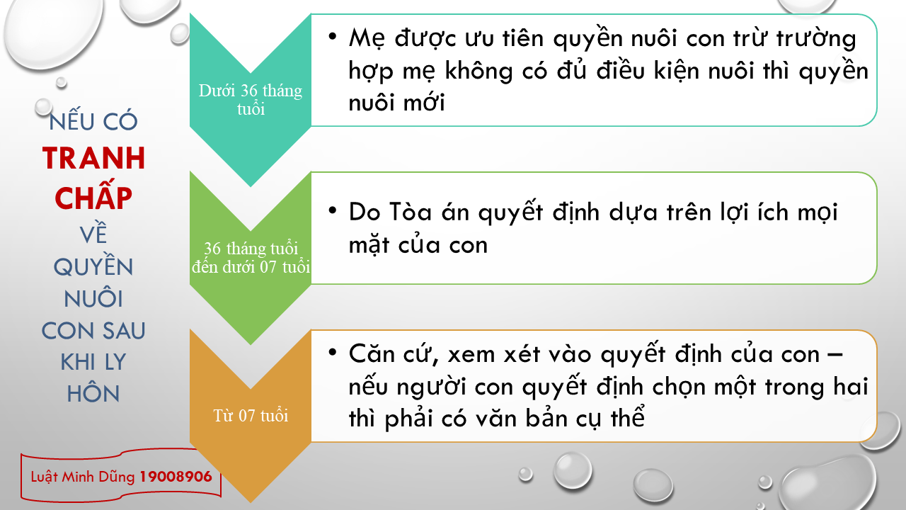 Tóm lại, quyền nuôi con có thể được vợ chồng thỏa thuận. Nhưng nếu phát sinh tranh chấp thì Tòa sẽ quyết định ai là người được trực tiếp nuôi con: