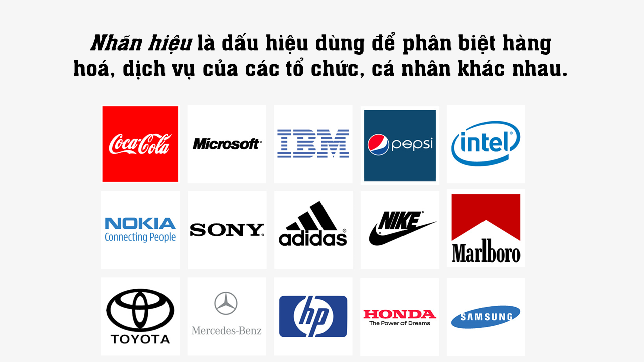 Nhãn hiệu (trade mark) theo định nghĩa của Tổ chức sở hữu trí tuệ thế giới (WIPO): nhãn hiệu là “các dấu hiệu dùng để phân biệt hàng hoá, dịch vụ cùng loại hoặc tương tự của các cơ sở sản xuất, kinh doanh khác nhau”.