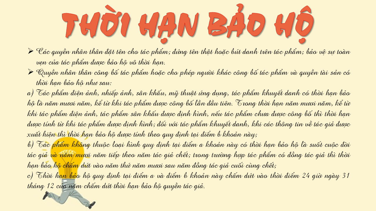 4. Bảo vệ sự toàn vẹn của tác phẩm, không cho người khác sửa chữa, cắt xén hoặc xuyên tạc tác phẩm dưới bất kỳ hình thức nào gây phương hại đến danh dự và uy tín của tác giả.”